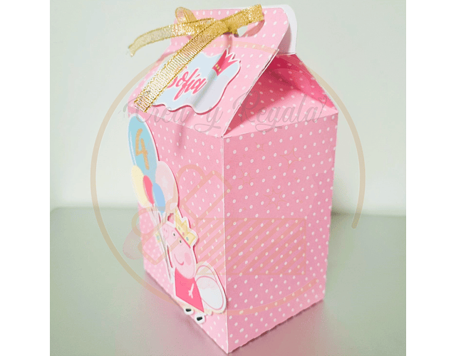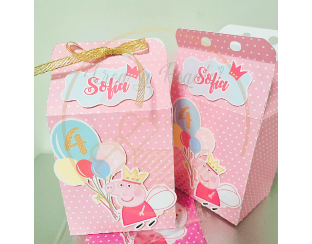 - Además puedes escoger un personaje y alguna forma o similar para poner en la parte superior de la caja, como en este caso la Peppa con los globos + el Nombre de la festejada.